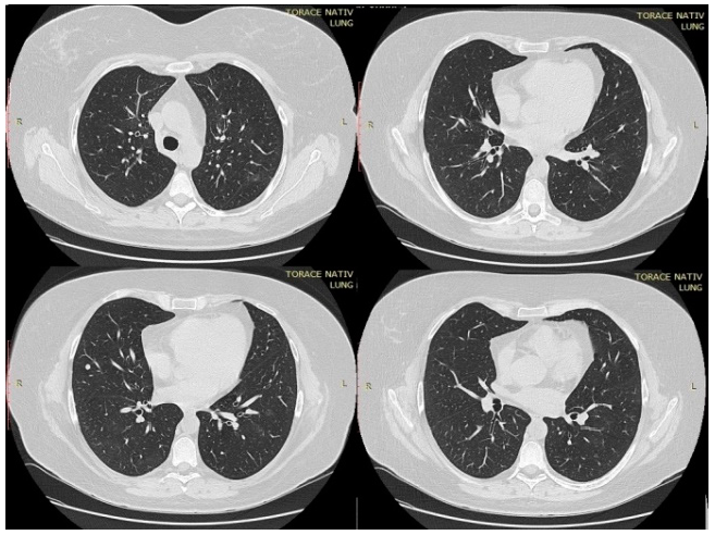 In the first day of hospitalization in our clinic, a native chest CT was performed and both lung fields presented trabecular peribronchovascular condensations (in the anterior upper right lobe segment and in basal segments in lower lobes) (Figure 1). A ground-glass component was associated with central peribronchovascular distribution, which accompanied the trabecular areas described above, with an extension <20%. On the 14th day of treatment, the CT scan was repeated. There was a significant improvement compared to the first scan. Bilateral lung lesions could no longer be observed, with the exception of a 6-mm node in the right middle lobe, probably of fibrous nature (Figure 2).